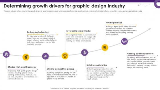 This slide caters to details about various growth drivers for graphic design industry which includes offering high-quality services, embracing technology, offering competitive pricing, and leveraging social media. Do you have to make sure that everyone on your team knows about any specific topic I yes, then you should give Creative Agency Business Plan Determining Growth Drivers For Graphic Design Industry BP SS V a try. Our experts have put a lot of knowledge and effort into creating this impeccable Creative Agency Business Plan Determining Growth Drivers For Graphic Design Industry BP SS V. You can use this template for your upcoming presentations, as the slides are perfect to represent even the tiniest detail. You can download these templates from the Slidegeeks website and these are easy to edit. So grab these today