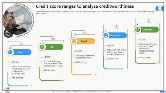 This slide shows details about various ranges of credit score. It includes ranges categorized as poor, fair, good, very good and excellent based on the different credit range in each category. Coming up with a presentation necessitates that the majority of the effort goes into the content and the message you intend to convey. The visuals of a PowerPoint presentation can only be effective if it supplements and supports the story that is being told. Keeping this in mind our experts created Credit Score Ranges To Analyze Creditworthiness Swipe Smartly A Practical Guide Fin SS V to reduce the time that goes into designing the presentation. This way, you can concentrate on the message while our designers take care of providing you with the right template for the situation.