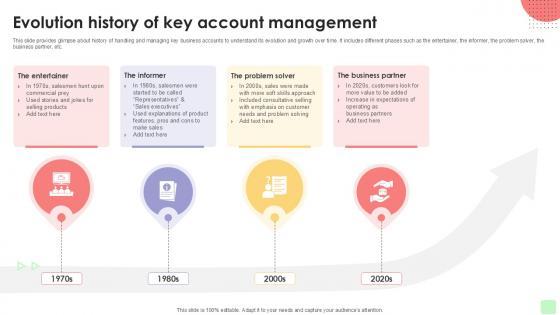 This slide provides glimpse about history of handling and managing key business accounts to understand its evolution and growth over time. It includes different phases such as the entertainer, the informer, the problem solver, the business partner, etc. While your presentation may contain top-notch content, if it lacks visual appeal, youre not fully engaging your audience. Introducing our Evolution History Of Key Detailed Business Account PPT PowerPoint Strategy SS V deck, designed to engage your audience. Our complete deck boasts a seamless blend of Creativity and versatility. You can effortlessly customize elements and color schemes to align with your brand identity. Save precious time with our pre-designed template, compatible with Microsoft versions and Google Slides. Plus, its downloadable in multiple formats like JPG, JPEG, and PNG. Elevate your presentations and outshine your competitors effortlessly with our visually stunning 100 percent editable deck.