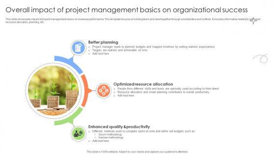 This slide showcases impact of project management basics on business performance. This template focuses on holding team and client together through uncertainties and conflicts. It includes information related to optimized recourse allocation, planning, etc. Crafting an eye-catching presentation has never been more straightforward. Let your presentation shine with this tasteful yet straightforward Executing And Monitoring Project Overall Impact Of Project Management Basics PM SS V template. It offers a minimalistic and classy look that is great for making a statement. The colors have been employed intelligently to add a bit of playfulness while still remaining professional. Construct the ideal Executing And Monitoring Project Overall Impact Of Project Management Basics PM SS V that effortlessly grabs the attention of your audience Begin now and be certain to wow your customers