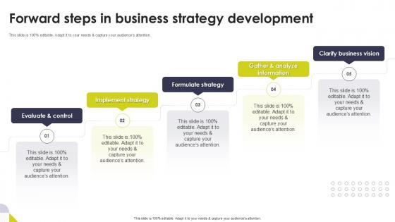 This slide is 100 percent editable. Adapt it to your needs and capture your audiences attention. Formulating a presentation can take up a lot of effort and time, so the content and message should always be the primary focus. The visuals of the PowerPoint can enhance the presenters message, so our Forward Steps In Business Strategy Development Way Forward Ppt Presentation was created to help save time. Instead of worrying about the design, the presenter can concentrate on the message while our designers work on creating the ideal templates for whatever situation is needed. Slidegeeks has experts for everything from amazing designs to valuable content, we have put everything into Forward Steps In Business Strategy Development Way Forward Ppt Presentation