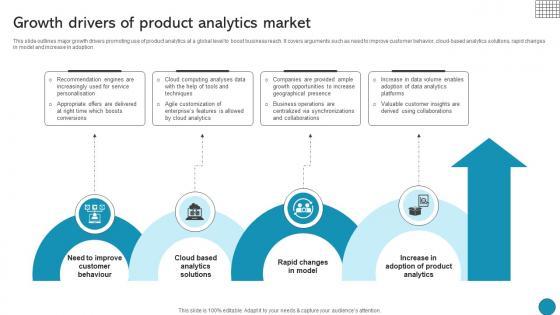 This slide outlines major growth drivers promoting use of product analytics at a global level to boost business reach. It covers arguments such as need to improve customer behavior, cloud-based analytics solutions, rapid changes in model and increase in adoption This modern and well-arranged Growth Drivers Of Product Analytics Market Product Analytics Implementation Data Analytics V provides lots of creative possibilities. It is very simple to customize and edit with the Powerpoint Software. Just drag and drop your pictures into the shapes. All facets of this template can be edited with Powerpoint, no extra software is necessary. Add your own material, put your images in the places assigned for them, adjust the colors, and then you can show your slides to the world, with an animated slide included.