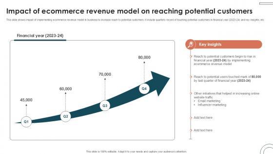 This slide shows impact of implementing ecommerce revenue model in business to increase reach to potential customers. It include quarterly record of touching potential customers in financial year 2023-24 and key insights, etc. The best PPT templates are a great way to save time, energy, and resources. Slidegeeks have 100 percent editable powerpoint slides making them incredibly versatile. With these quality presentation templates, you can create a captivating and memorable presentation by combining visually appealing slides and effectively communicating your message. Download Impact Of Ecommerce Revenue Internet Based Trade Structure Ppt Sample from Slidegeeks and deliver a wonderful presentation.