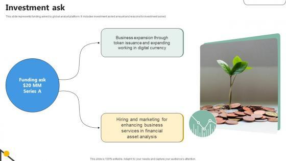 This slide represents funding asked by global analyst platform. It includes investment asked amount and reasons for investment asked.Create an editable Investment Ask Analytics Company Investor Funding Elevator that communicates your idea and engages your audience. Whether you are presenting a business or an educational presentation, pre-designed presentation templates help save time. Investment Ask Analytics Company Investor Funding Elevator is highly customizable and very easy to edit, covering many different styles from creative to business presentations. Slidegeeks has creative team members who have crafted amazing templates. So, go and get them without any delay.
