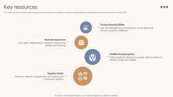 This slide covers the important assets required to operate a business successfully. It includes production facilities, intellectual property, human resources, and supply chain. Slidegeeks is here to make your presentations a breeze with Key Resources Automotive Assembly Business Model BMC SS V With our easy-to-use and customizable templates, you can focus on delivering your ideas rather than worrying about formatting. With a variety of designs to choose from, you are sure to find one that suits your needs. And with animations and unique photos, illustrations, and fonts, you can make your presentation pop. So whether you are giving a sales pitch or presenting to the board, make sure to check out Slidegeeks first