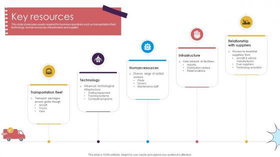 This slide showcases assets required for business operations such as transportation fleet, technology, human resources, infrastructure and supplier. Slidegeeks is here to make your presentations a breeze with Key Resources Delivery Service Provider Business Model BMC SS V With our easy-to-use and customizable templates, you can focus on delivering your ideas rather than worrying about formatting. With a variety of designs to choose from, you are sure to find one that suits your needs. And with animations and unique photos, illustrations, and fonts, you can make your presentation pop. So whether you are giving a sales pitch or presenting to the board, make sure to check out Slidegeeks first
