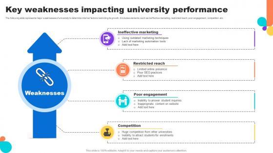 The following slide represents major weaknesses of university to determine internal factors restricting its growth. It includes elements such as ineffective marketing, restricted reach, poor engagement, competition etc. The best PPT templates are a great way to save time, energy, and resources. Slidegeeks have 100 percent editable powerpoint slides making them incredibly versatile. With these quality presentation templates, you can create a captivating and memorable presentation by combining visually appealing slides and effectively communicating your message. Download Key Weaknesses Impacting University Performance Key Step To Implementation University Strategy SS V from Slidegeeks and deliver a wonderful presentation.