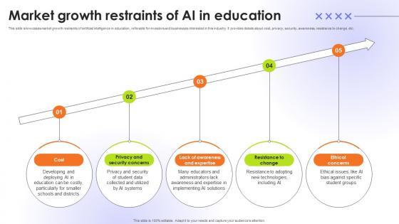 This slide showcases market growth restraints of artificial intelligence in education, referable for investors and businesses interested in this industry. It provides details about cost, privacy, security, awareness, resistance to change, etc. Slidegeeks is one of the best resources for PowerPoint templates. You can download easily and regulate Market Growth Restraints Of AI In Education Educational Transformation Through AI SS V for your personal presentations from our wonderful collection. A few clicks is all it takes to discover and get the most relevant and appropriate templates. Use our Templates to add a unique zing and appeal to your presentation and meetings. All the slides are easy to edit and you can use them even for advertisement purposes.