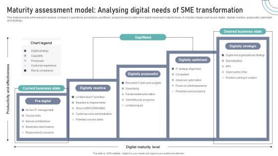This slide presents a framework to analyze companys operations, procedures, workflows, and processes to determine digital needs and maturity levels. It includes stages such as pre-digital , digitally reactive, purposeful, optimized and strategic.Slidegeeks is here to make your presentations a breeze with Maturity Assessment Model Analysing Digital Needs Of SME Transformation DT SS V With our easy-to-use and customizable templates, you can focus on delivering your ideas rather than worrying about formatting. With a variety of designs to choose from, you are sure to find one that suits your needs. And with animations and unique photos, illustrations, and fonts, you can make your presentation pop. So whether you are giving a sales pitch or presenting to the board, make sure to check out Slidegeeks first