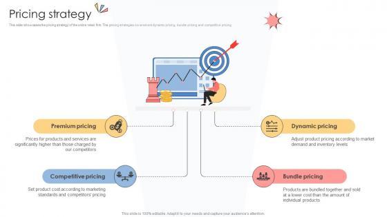 This slide showcases the pricing strategy of the online retail firm. The pricing strategies covered are dynamic pricing, bundle pricing and competitive pricing. Do you have an important presentation coming up Are you looking for something that will make your presentation stand out from the rest Look no further than Pricing Strategy Online Shopping Business Model BMC SS V. With our professional designs, you can trust that your presentation will pop and make delivering it a smooth process. And with Slidegeeks, you can trust that your presentation will be unique and memorable. So why wait Grab Pricing Strategy Online Shopping Business Model BMC SS V today and make your presentation stand out from the rest.