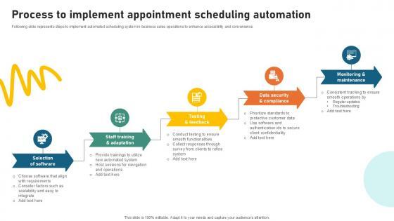 Following slide represents steps to implement automated scheduling system in business sales operations to enhance accessibility and convenience. Retrieve professionally designed Process To Implement Appointment Sample Pitch Deck For Video Ppt Template to effectively convey your message and captivate your listeners. Save time by selecting pre-made slideshows that are appropriate for various topics, from business to educational purposes. These themes come in many different styles, from creative to corporate, and all of them are easily adjustable and can be edited quickly. Access them as PowerPoint templates or as Google Slides themes. You do not have to go on a hunt for the perfect presentation because Slidegeeks got you covered from everywhere.