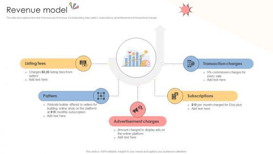 This slide showcases online retail firms sources of revenue. It includes listing fees, pattern, subscriptions, advertisements and transactional charges. Find highly impressive Revenue Model Online Shopping Business Model BMC SS V on Slidegeeks to deliver a meaningful presentation. You can save an ample amount of time using these presentation templates. No need to worry to prepare everything from scratch because Slidegeeks experts have already done a huge research and work for you. You need to download Revenue Model Online Shopping Business Model BMC SS V for your upcoming presentation. All the presentation templates are 100 percent editable and you can change the color and personalize the content accordingly. Download now
