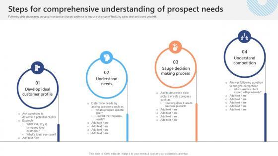 Following slide showcases process to understand target audience to improve chances of finalizing sales deal and brand goodwill. Are you searching for a Steps For Comprehensive Understanding Effective Strategies To Succeed At Virtual Ppt Slide SA SS V that is uncluttered, straightforward, and original Its easy to edit, and you can change the colors to suit your personal or business branding. For a presentation that expresses how much effort you have put in, this template is ideal With all of its features, including tables, diagrams, statistics, and lists, its perfect for a business plan presentation. Make your ideas more appealing with these professional slides. Download Steps For Comprehensive Understanding Effective Strategies To Succeed At Virtual Ppt Slide SA SS V from Slidegeeks today.