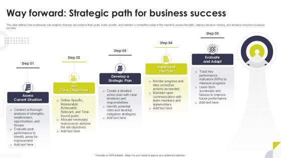 This slide defines how businesses can adapt to changes and achieve their goals, foster growth, and maintain a competitive edge in the market to ensure flexibility, improve decision-making, and enhance long-term business success. The Way Forward Strategic Path For Business Success Way Forward Ppt Presentation is a compilation of the most recent design trends as a series of slides. It is suitable for any subject or industry presentation, containing attractive visuals and photo spots for businesses to clearly express their messages. This template contains a variety of slides for the user to input data, such as structures to contrast two elements, bullet points, and slides for written information. Slidegeeks is prepared to create an impression.