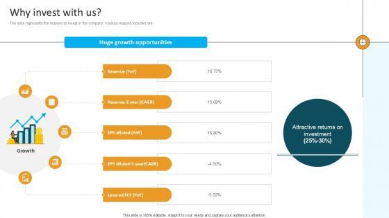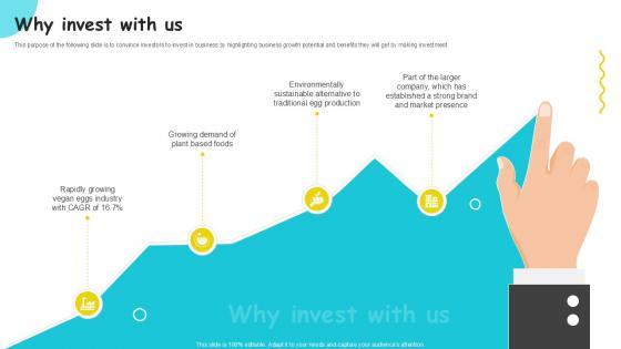 This purpose of the following slide is to convince investors to invest in business by highlighting business growth potential and benefits they will get by making investment. Presenting this PowerPoint presentation, titled Why Invest With Us Plant Based Eggs Developing Company Investor PPT Example, with topics curated by our researchers after extensive research. This editable presentation is available for immediate download and provides attractive features when used. Download now and captivate your audience. Presenting this Why Invest With Us Plant Based Eggs Developing Company Investor PPT Example. Our researchers have carefully researched and created these slides with all aspects taken into consideration. This is a completely customizable Why Invest With Us Plant Based Eggs Developing Company Investor PPT Example that is available for immediate downloading. Download now and make an impact on your audience. Highlight the attractive features available with our PPTs.