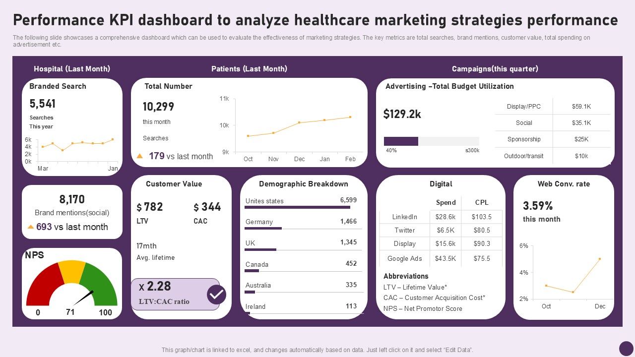 The following slide showcases a comprehensive dashboard which can be used to evaluate the effectiveness of marketing strategies. The key metrics are total searches, brand mentions, customer value, total spending on advertisement etc. Slidegeeks is one of the best resources for PowerPoint templates. You can download easily and regulate Guide To Healthcare Services Administration Performance KPI Dashboard To Analyze Healthcare Marketing Clipart PDF for your personal presentations from our wonderful collection. A few clicks is all it takes to discover and get the most relevant and appropriate templates. Use our Templates to add a unique zing and appeal to your presentation and meetings. All the slides are easy to edit and you can use them even for advertisement purposes.