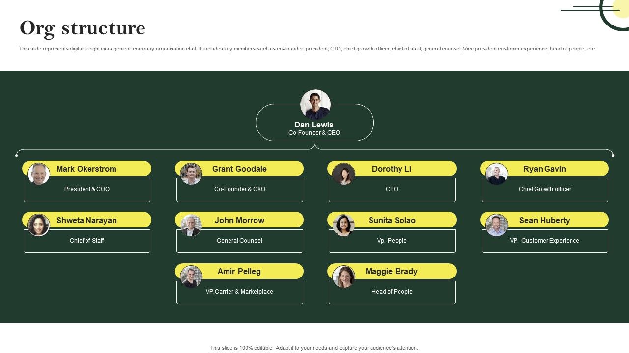 This slide represents digital freight management company organisation chat. It includes key members such as co-founder, president, CTO, chief growth officer, chief of staff, general counsel, Vice president customer experience, head of people, etc. Retrieve professionally designed Org Structure Logistic Company Investor Fund Raising Pitch Deck Template PDF to effectively convey your message and captivate your listeners. Save time by selecting pre-made slideshows that are appropriate for various topics, from business to educational purposes. These themes come in many different styles, from creative to corporate, and all of them are easily adjustable and can be edited quickly. Access them as PowerPoint templates or as Google Slides themes. You do not have to go on a hunt for the perfect presentation because Slidegeeks got you covered from everywhere.