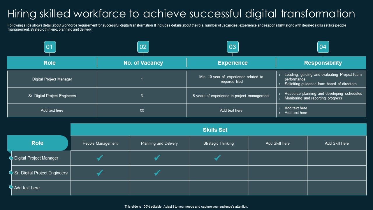 Following slide shows detail about workforce requirement for successful digital transformation. It includes details about the role, number of vacancies, experience and responsibility along with desired skills set like people management, strategic thinking, planning and delivery. The Hiring Skilled Workforce To Achieve Successful Digital Transformation Guidelines PDF is a compilation of the most recent design trends as a series of slides. It is suitable for any subject or industry presentation, containing attractive visuals and photo spots for businesses to clearly express their messages. This template contains a variety of slides for the user to input data, such as structures to contrast two elements, bullet points, and slides for written information. Slidegeeks is prepared to create an impression.