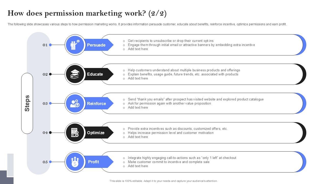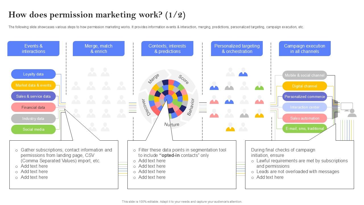 The following slide showcases various steps to how permission marketing works. It provides information events and interaction, merging, predictions, personalized targeting, campaign execution, etc. This How Does Permission Marketing Work Ppt PowerPoint Presentation File Pictures PDF from Slidegeeks makes it easy to present information on your topic with precision. It provides customization options, so you can make changes to the colors, design, graphics, or any other component to create a unique layout. It is also available for immediate download, so you can begin using it right away. Slidegeeks has done good research to ensure that you have everything you need to make your presentation stand out. Make a name out there for a brilliant performance.