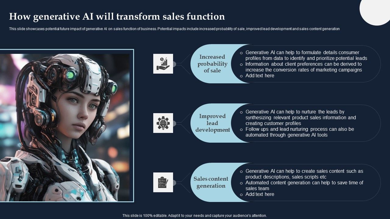 This slide showcases potential future impact of generative AI on sales function of business. Potential impacts include increased probability of sale, improved lead development and sales content generation. Formulating a presentation can take up a lot of effort and time, so the content and message should always be the primary focus. The visuals of the PowerPoint can enhance the presenters message, so our How Generative AI Will Transform Sales Function Ideas PDF was created to help save time. Instead of worrying about the design, the presenter can concentrate on the message while our designers work on creating the ideal templates for whatever situation is needed. Slidegeeks has experts for everything from amazing designs to valuable content, we have put everything into How Generative AI Will Transform Sales Function Ideas PDF.