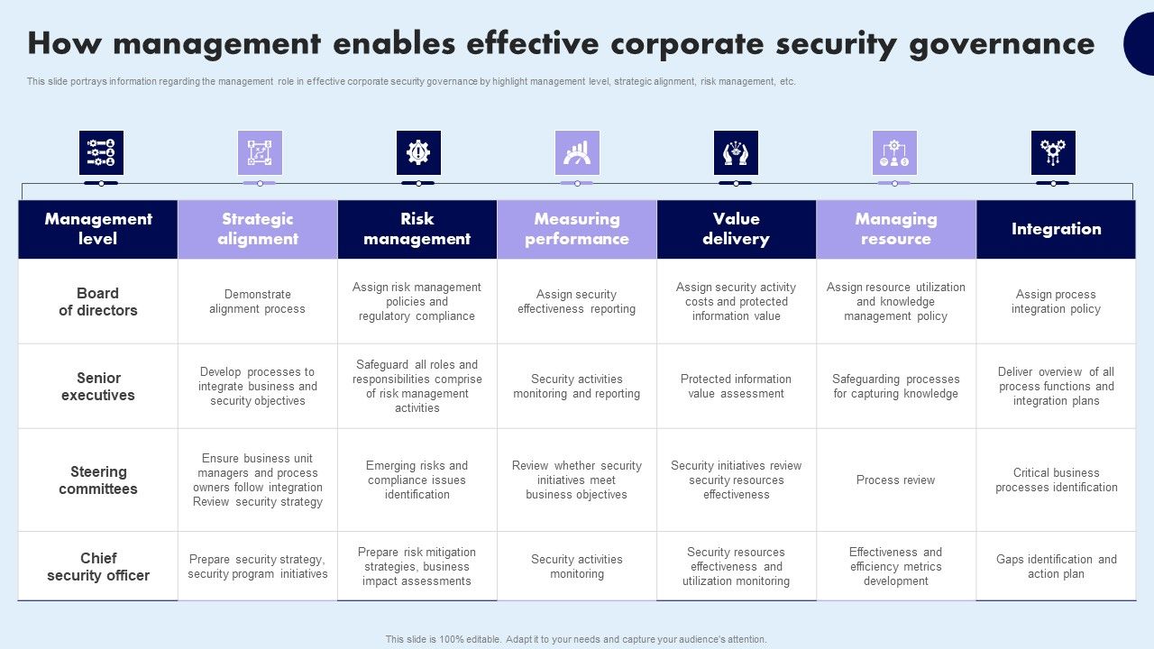 This slide portrays information regarding the management role in effective corporate security governance by highlight management level, strategic alignment, risk management, etc. Crafting an eye-catching presentation has never been more straightforward. Let your presentation shine with this tasteful yet straightforward How Management Enables Effective Corporate Security Governance Topics PDF template. It offers a minimalistic and classy look that is great for making a statement. The colors have been employed intelligently to add a bit of playfulness while still remaining professional. Construct the ideal How Management Enables Effective Corporate Security Governance Topics PDF that effortlessly grabs the attention of your audience Begin now and be certain to wow your customers