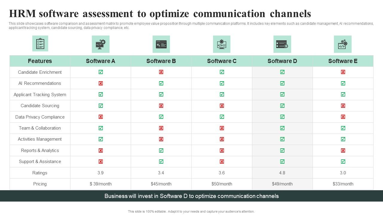 This slide showcases software comparison and assessment matrix to promote employee value proposition through multiple communication platforms. It includes key elements such as candidate management, AI recommendations, applicant tracking system, candidate sourcing, data privacy compliance, etc. Make sure to capture your audiences attention in your business displays with our gratis customizable HRM Software Assessment To Optimize Communication Channels Introduction PDF These are great for business strategies, office conferences, capital raising or task suggestions. If you desire to acquire more customers for your tech business and ensure they stay satisfied, create your own sales presentation with these plain slides.