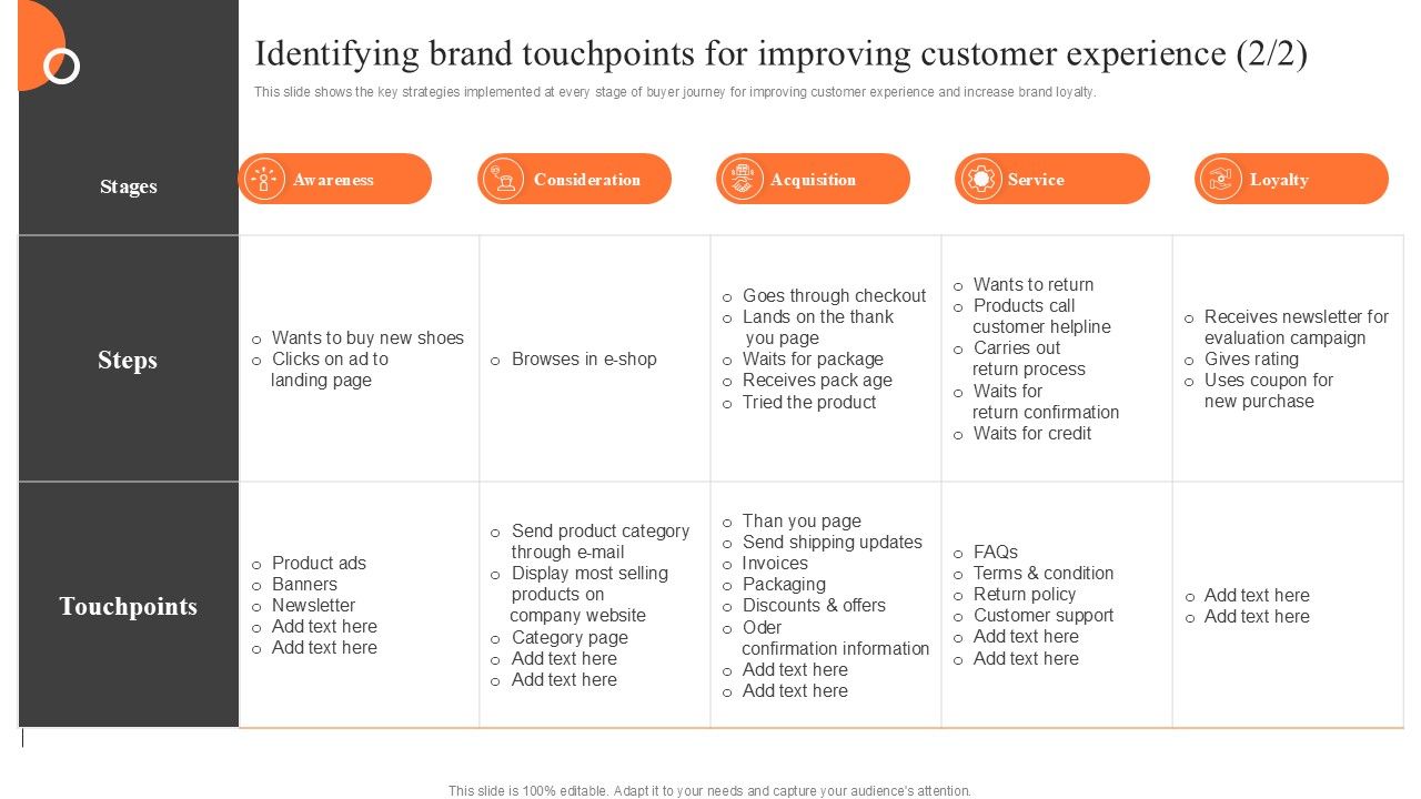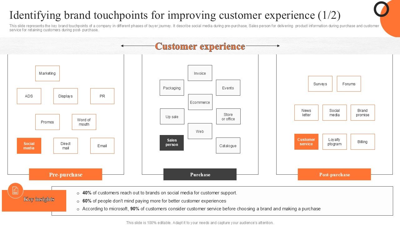 This slide represents the key brand touchpoints of a company in different phases of buyer journey. It describe social media during pre-purchase, Sales person for delivering product information during purchase and customer service for retaining customers during post- purchase. Find highly impressive Identifying Brand Touchpoints For Improving Customer Experience Mockup PDF on Slidegeeks to deliver a meaningful presentation. You can save an ample amount of time using these presentation templates. No need to worry to prepare everything from scratch because Slidegeeks experts have already done a huge research and work for you. You need to download Identifying Brand Touchpoints For Improving Customer Experience Mockup PDF for your upcoming presentation. All the presentation templates are 100 percent editable and you can change the color and personalize the content accordingly. Download now.