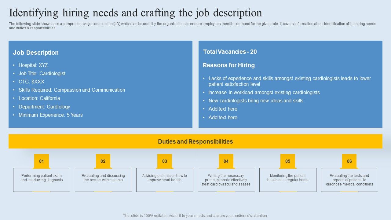 The following slide showcases a comprehensive job description JD which can be used by the organizations to ensure employees meet the demand for the given role. It covers information about identification of the hiring needs and duties and responsibilities. This Identifying Hiring Needs And Crafting The Job Description Professional PDF is perfect for any presentation, be it in front of clients or colleagues. It is a versatile and stylish solution for organizing your meetings. The Identifying Hiring Needs And Crafting The Job Description Professional PDF features a modern design for your presentation meetings. The adjustable and customizable slides provide unlimited possibilities for acing up your presentation. Slidegeeks has done all the homework before launching the product for you. So, do not wait, grab the presentation templates today