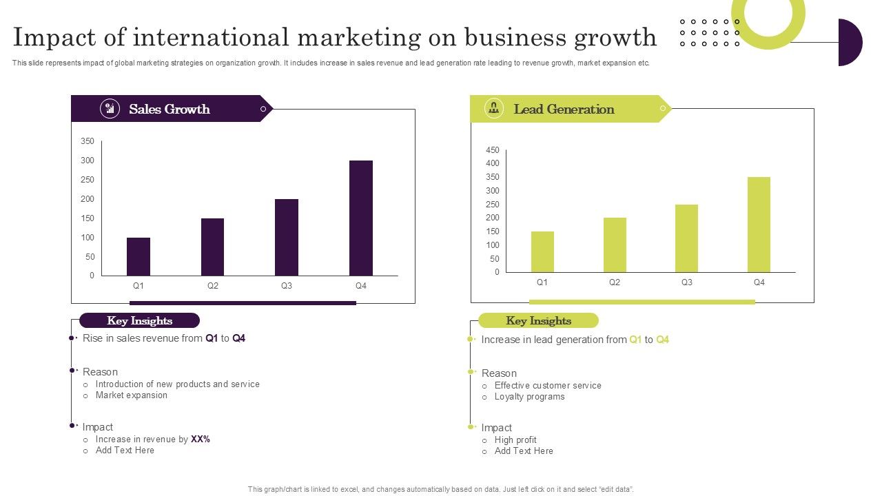 This slide represents impact of global marketing strategies on organization growth. It includes increase in sales revenue and lead generation rate leading to revenue growth, market expansion etc. Formulating a presentation can take up a lot of effort and time, so the content and message should always be the primary focus. The visuals of the PowerPoint can enhance the presenters message, so our Impact Of International Marketing On Business Growth Template PDF was created to help save time. Instead of worrying about the design, the presenter can concentrate on the message while our designers work on creating the ideal templates for whatever situation is needed. Slidegeeks has experts for everything from amazing designs to valuable content, we have put everything into Impact Of International Marketing On Business Growth Template PDF.