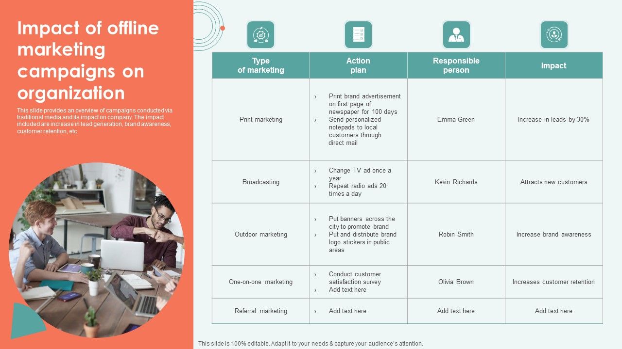 This slide provides an overview of campaigns conducted via traditional media and its impact on company. The impact included are increase in lead generation, brand awareness, customer retention, etc. There are so many reasons you need a Impact Of Offline Marketing Campaigns On Organization Ppt Styles Deck PDF. The first reason is you can not spend time making everything from scratch, Thus, Slidegeeks has made presentation templates for you too. You can easily download these templates from our website easily.