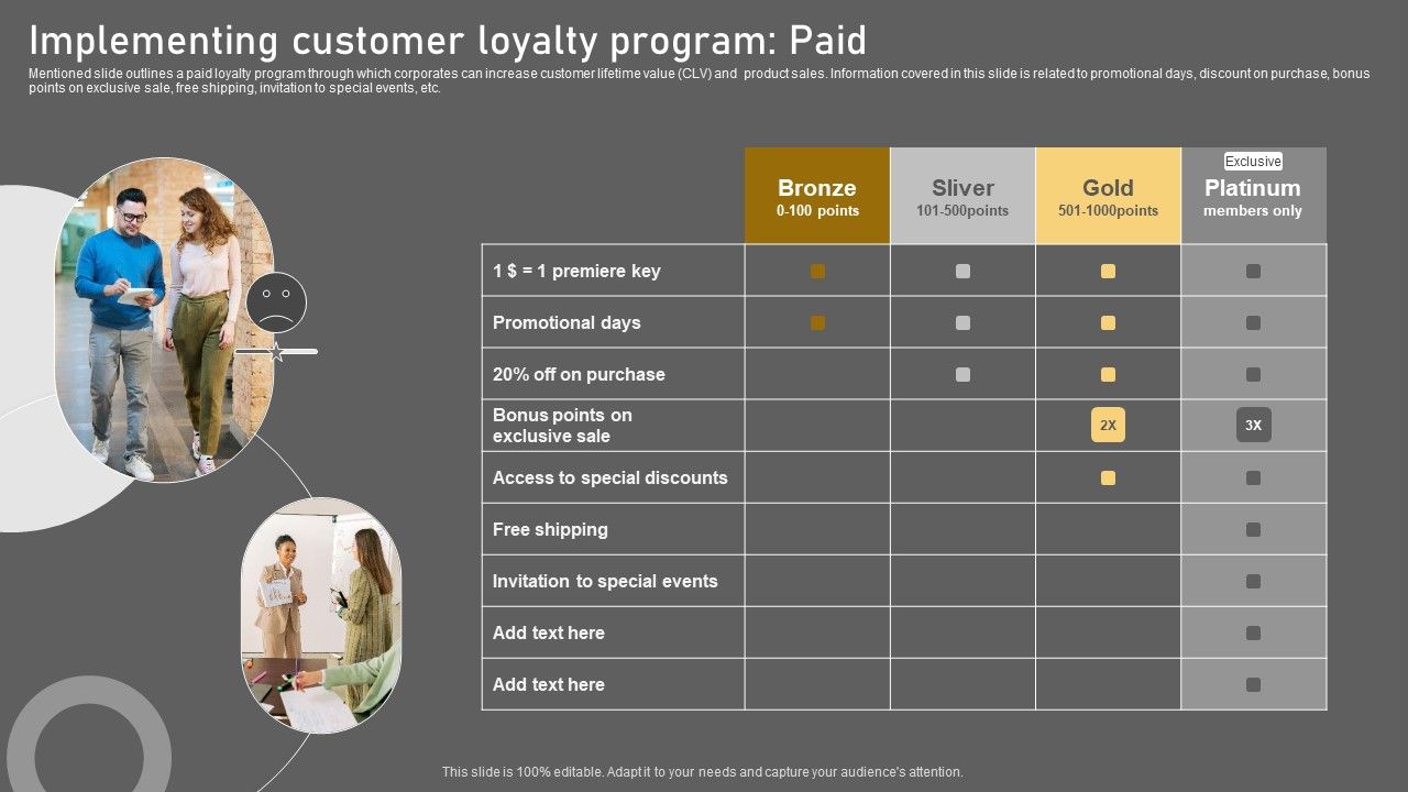 Mentioned slide outlines a paid loyalty program through which corporates can increase customer lifetime value CLV and product sales. Information covered in this slide is related to promotional days, discount on purchase, bonus points on exclusive sale, free shipping, invitation to special events, etc. There are so many reasons you need a Implementing Customer Loyalty Program Paid Guidelines PDF. The first reason is you can not spend time making everything from scratch, Thus, Slidegeeks has made presentation templates for you too. You can easily download these templates from our website easily.