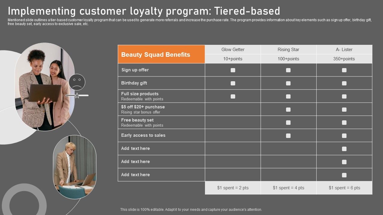 Mentioned slide outlines a tier-based customer loyalty program that can be used to generate more referrals and increase the purchase rate. The program provides information about key elements such as sign up offer, birthday gift, free beauty set, early access to exclusive sale, etc. Do you have to make sure that everyone on your team knows about any specific topic I yes, then you should give Implementing Customer Loyalty Program Tiered Based Pictures PDF a try. Our experts have put a lot of knowledge and effort into creating this impeccable Implementing Customer Loyalty Program Tiered Based Pictures PDF. You can use this template for your upcoming presentations, as the slides are perfect to represent even the tiniest detail. You can download these templates from the Slidegeeks website and these are easy to edit. So grab these today.