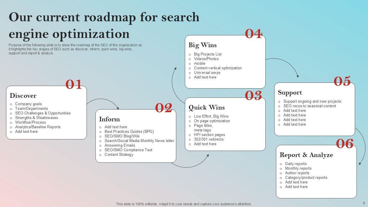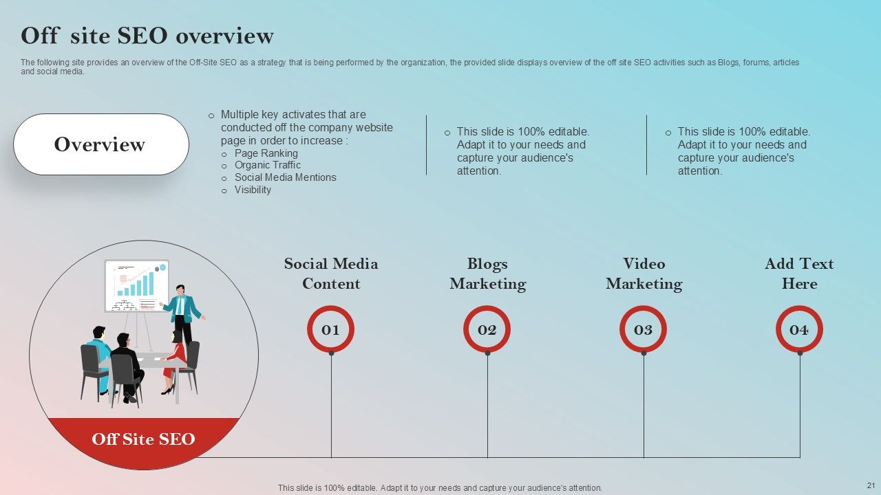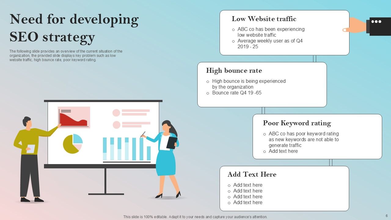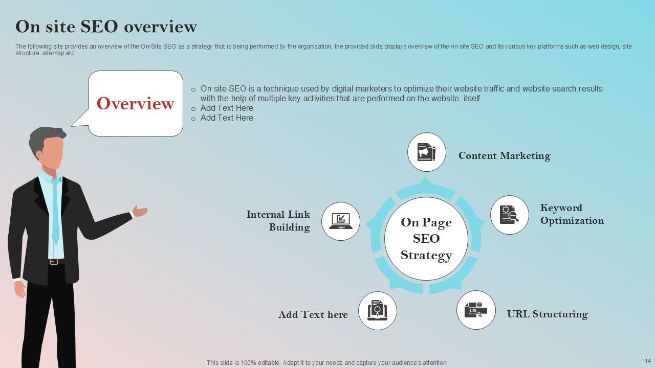 In this Implementing On Site SEO Strategy To Expand Customer Reach Ppt PowerPoint Presentation Complete Deck With Slides, we detail the way one can plan on timelines innovation and making the best of resources. We also present to you the importance of documenting every major strategic move. In this fourty six slide presentation template, we also include umbrella concepts to make sure your authority as a handsome business person is enhanced. As always, the editable and customizable benefit is also provided making you emerge as the business Guru. Download now to establish your superiority in both running a business, and being confident enough to present about it.