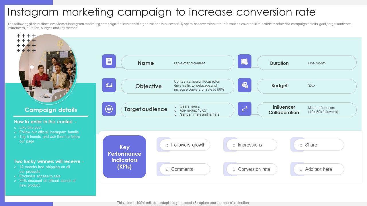 The following slide outlines overview of Instagram marketing campaign that can assist organizations to successfully optimize conversion rate. Information covered in this slide is related to campaign details, goal, target audience, influencers, duration, budget, and key metrics. Do you have an important presentation coming up Are you looking for something that will make your presentation stand out from the rest Look no further than Instagram Marketing Campaign To Increase Conversion Rate Template PDF. With our professional designs, you can trust that your presentation will pop and make delivering it a smooth process. And with Slidegeeks, you can trust that your presentation will be unique and memorable. So why wait Grab Instagram Marketing Campaign To Increase Conversion Rate Template PDF today and make your presentation stand out from the rest.