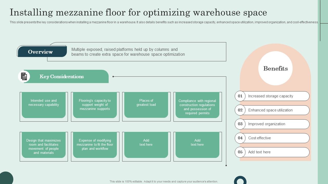 This slide presents the key considerations when installing a mezzanine floor in a warehouse. It also details benefits such as increased storage capacity, enhanced space utilization, improved organization, and cost-effectiveness. This modern and well-arranged Installing Mezzanine Floor For Optimizing Warehouse Space Topics PDF provides lots of creative possibilities. It is very simple to customize and edit with the Powerpoint Software. Just drag and drop your pictures into the shapes. All facets of this template can be edited with Powerpoint, no extra software is necessary. Add your own material, put your images in the places assigned for them, adjust the colors, and then you can show your slides to the world, with an animated slide included.