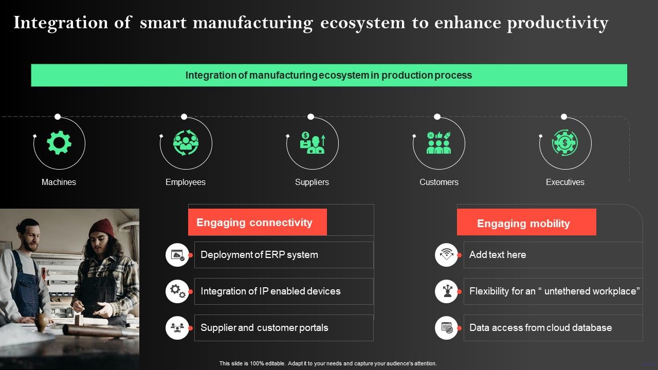 Slidegeeks is one of the best resources for PowerPoint templates. You can download easily and regulate Integration Of Smart Manufacturing Ecosystem To Enhance Productivity Slides PDF for your personal presentations from our wonderful collection. A few clicks is all it takes to discover and get the most relevant and appropriate templates. Use our Templates to add a unique zing and appeal to your presentation and meetings. All the slides are easy to edit and you can use them even for advertisement purposes.