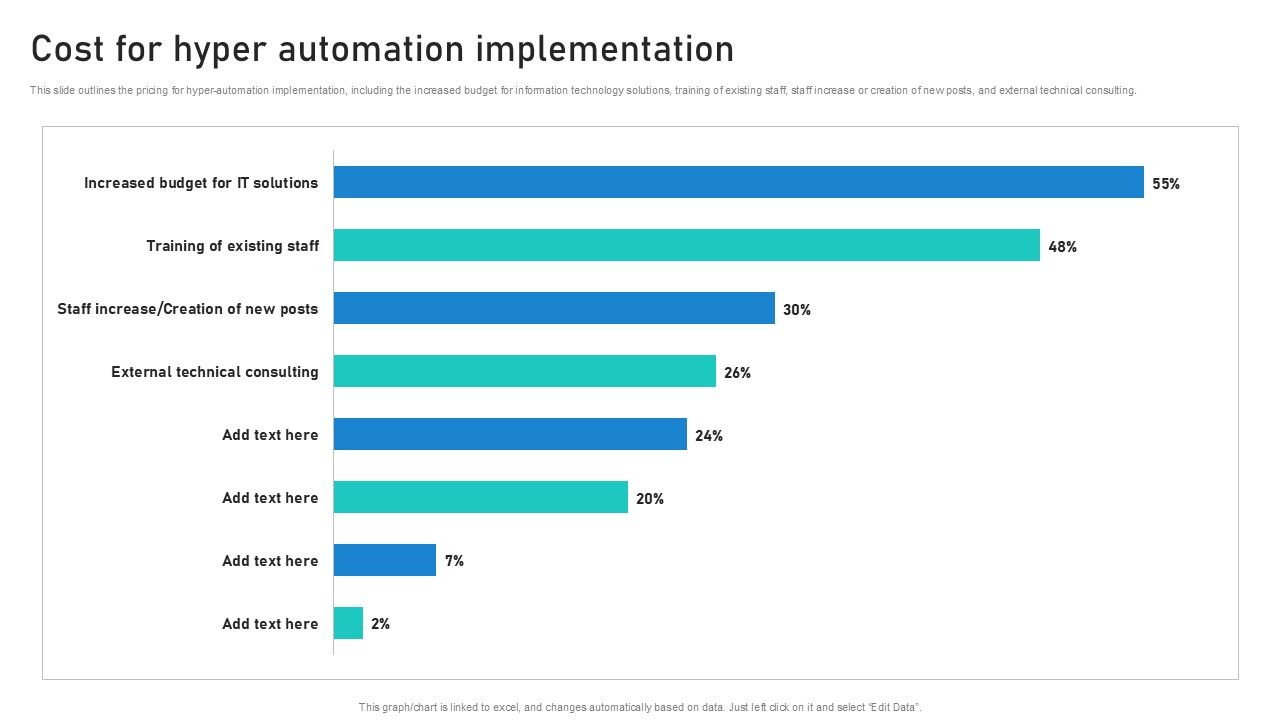 This slide outlines the pricing for hyper-automation implementation, including the increased budget for information technology solutions, training of existing staff, staff increase or creation of new posts, and external technical consulting. The best PPT templates are a great way to save time, energy, and resources. Slidegeeks have 100 percent editable powerpoint slides making them incredibly versatile. With these quality presentation templates, you can create a captivating and memorable presentation by combining visually appealing slides and effectively communicating your message. Download Intelligent Process Automation IPA Cost For Hyper Automation Implementation Topics PDF from Slidegeeks and deliver a wonderful presentation.
