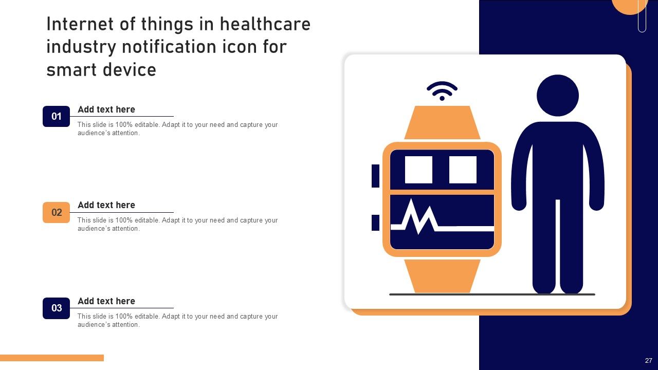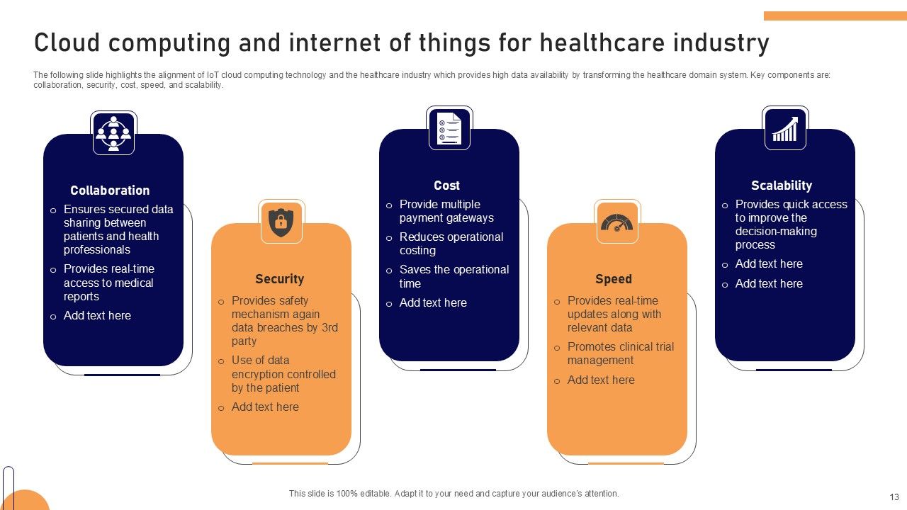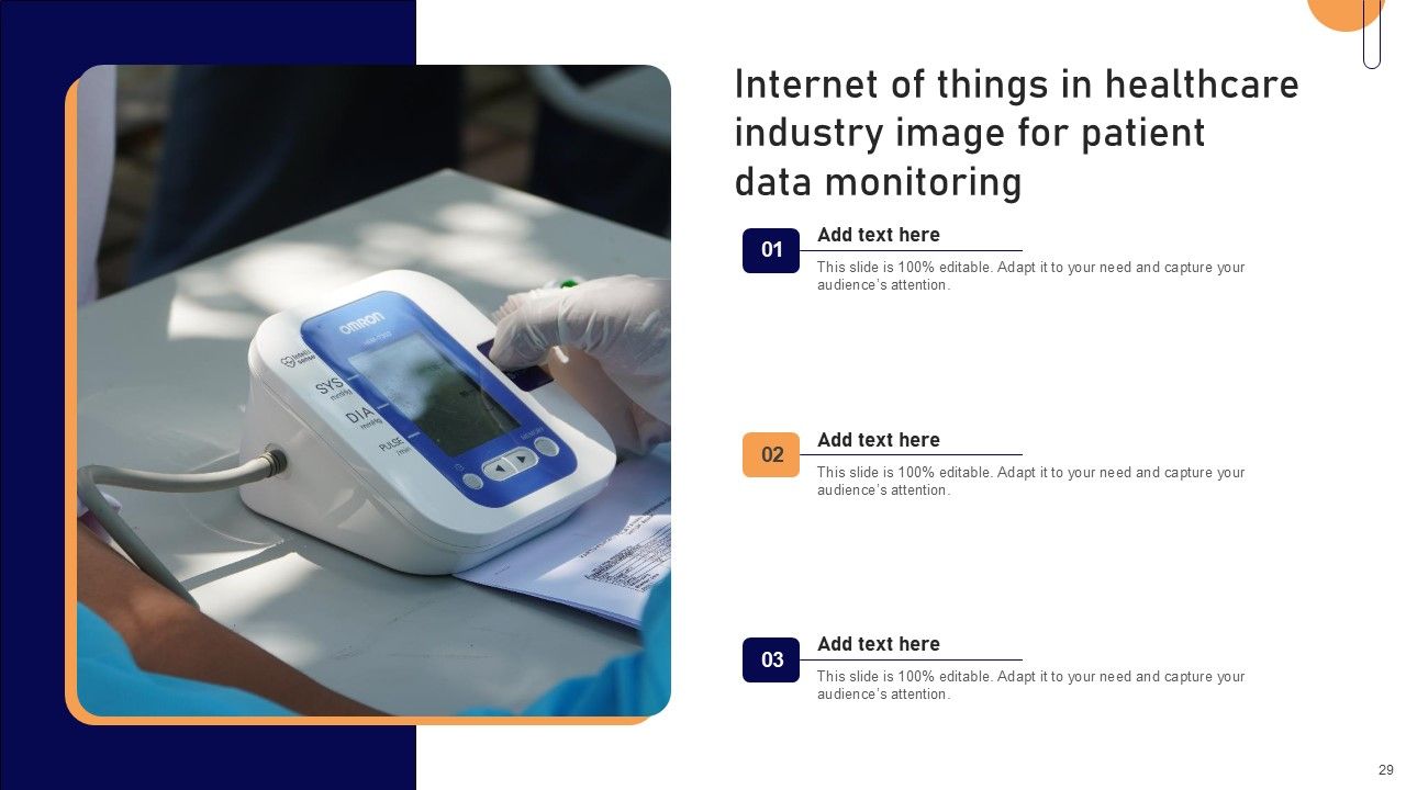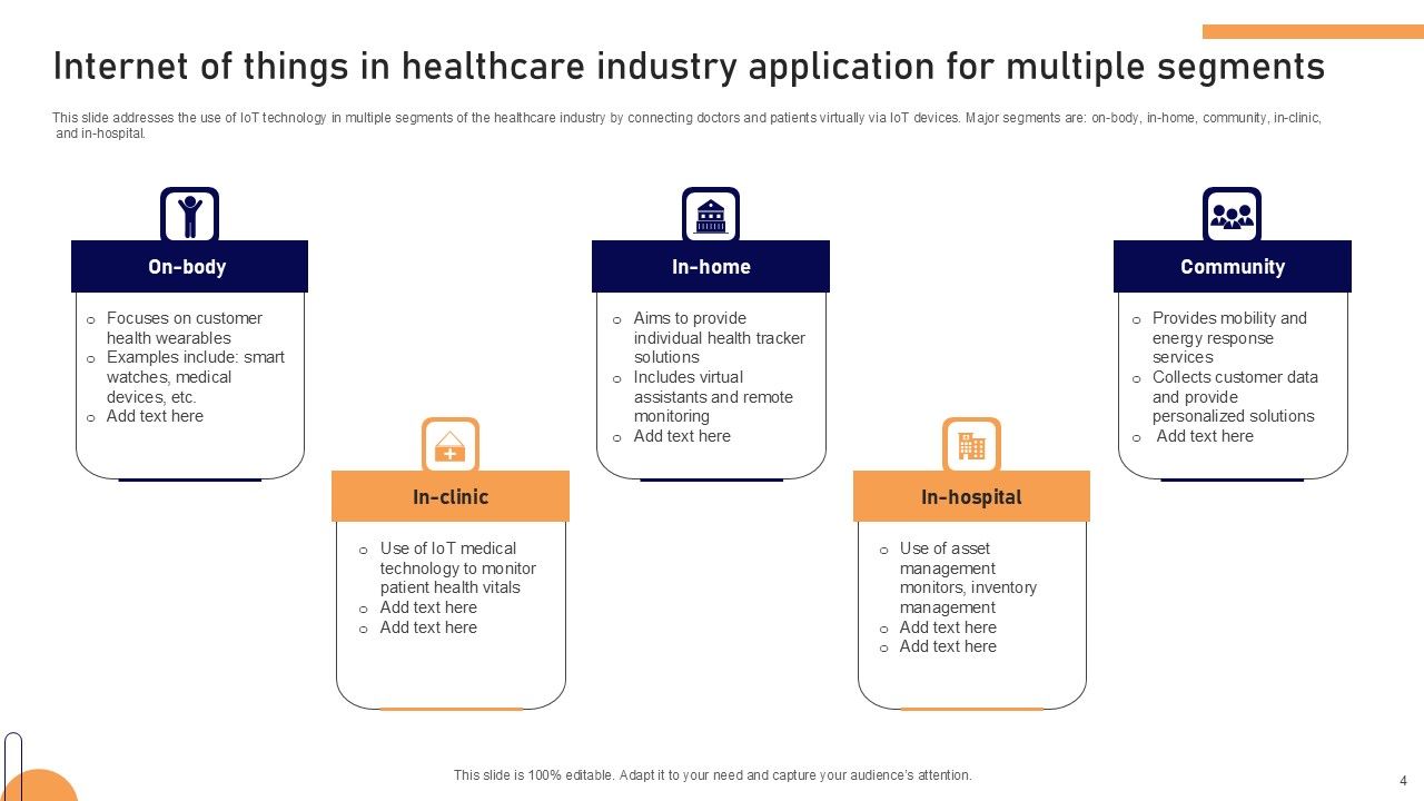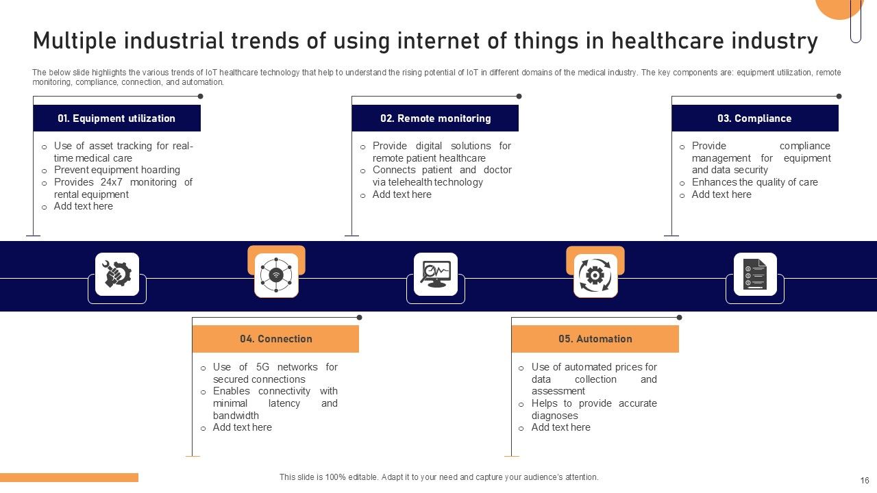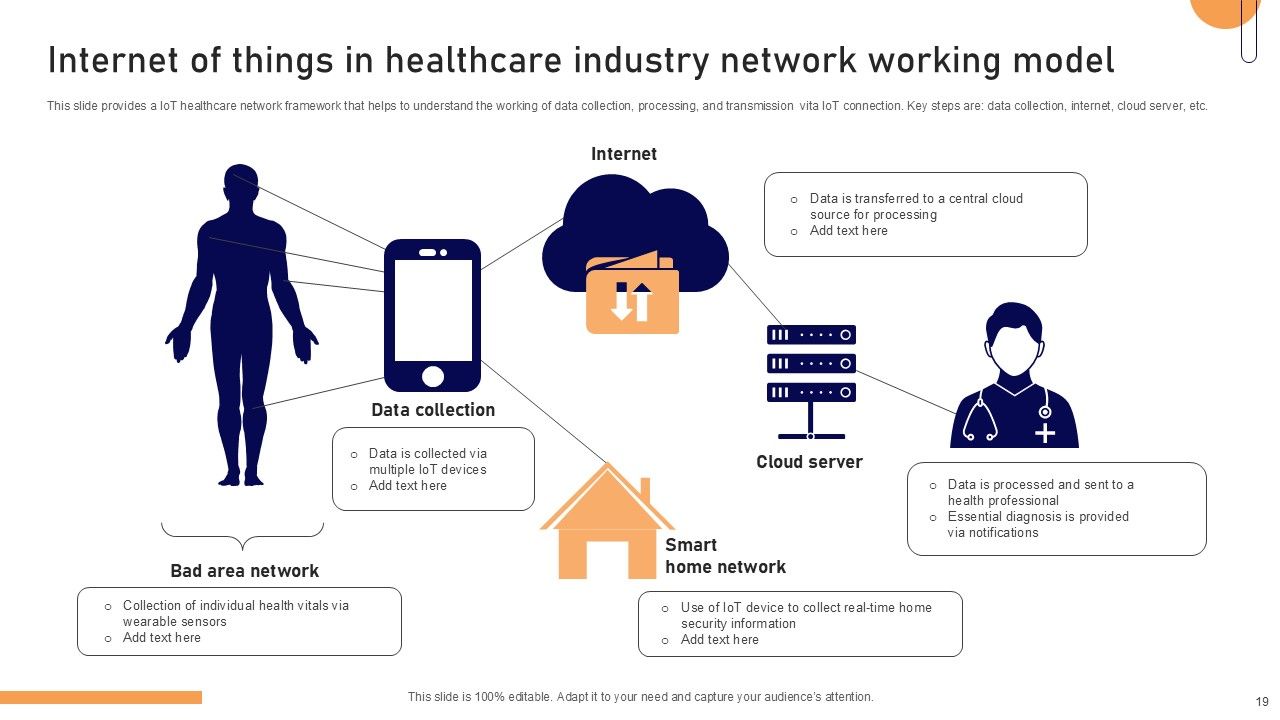 This Internet Of Things In Healthcare Industry Ppt PowerPoint Presentation Complete Deck With Slides acts as backup support for your ideas, vision, thoughts, etc. Use it to present a thorough understanding of the topic. This PPT slideshow can be utilized for both in-house and outside presentations depending upon your needs and business demands. Entailing thirty one slides with a consistent design and theme, this template will make a solid use case. As it is intuitively designed, it suits every business vertical and industry. All you have to do is make a few tweaks in the content or any other component to design unique presentations. The biggest advantage of this complete deck is that it can be personalized multiple times once downloaded. The color, design, shapes, and other elements are free to modify to add personal touches. You can also insert your logo design in this PPT layout. Therefore a well-thought and crafted presentation can be delivered with ease and precision by downloading this Internet Of Things In Healthcare Industry Ppt PowerPoint Presentation Complete Deck With Slides PPT slideshow.