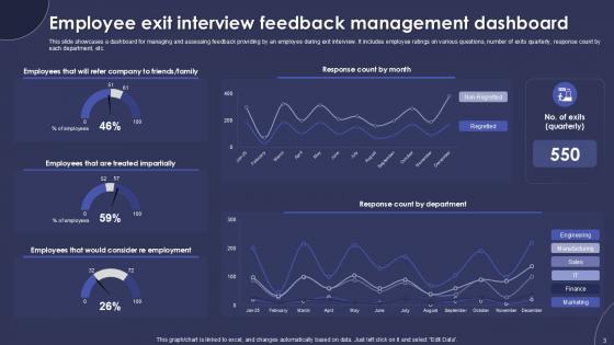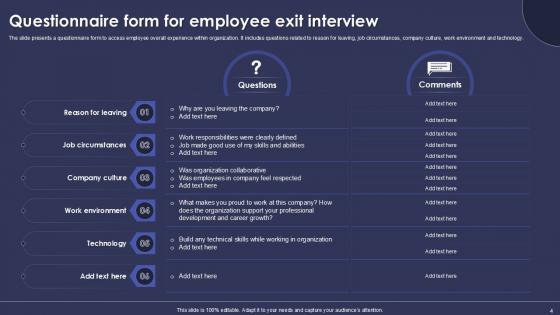 With well-researched insights and carefully-constructed design, this Employee Exit Interview Powerpoint Ppt Template Bundle is all that you need for your next business meeting with clients and win them over. Add your data to graphs, charts, and tables that are already ready to display it with stunning visuals and help your audience recall your work. With this PPT Complete Deck, you will be able to display your knowledge of the subject as well as your skills as a communicator. Share your ideas and make an impact on the audience with this PowerPoint Layout and ensure that you are known as a presentation professional. Download this PPT Template Bundle to create the most interesting presentation anyone has ever seen.