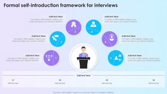Slidegeeks is here to make your presentations a breeze with Formal Self Introduction Framework For Interviews Infographic Template With our easy-to-use and customizable templates, you can focus on delivering your ideas rather than worrying about formatting. With a variety of designs to choose from, you are sure to find one that suits your needs. And with animations and unique photos, illustrations, and fonts, you can make your presentation pop. So whether you are giving a sales pitch or presenting to the board, make sure to check out Slidegeeks first