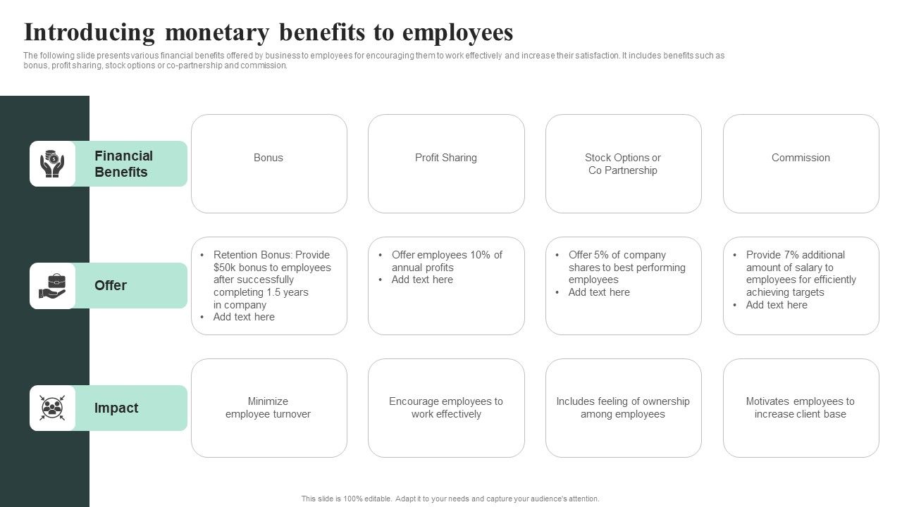 The following slide presents various financial benefits offered by business to employees for encouraging them to work effectively and increase their satisfaction. It includes benefits such as bonus, profit sharing, stock options or co-partnership and commission. Explore a selection of the finest Introducing Monetary Benefits To Employees Clipart PDF here. With a plethora of professionally designed and pre made slide templates, you can quickly and easily find the right one for your upcoming presentation. You can use our Introducing Monetary Benefits To Employees Clipart PDF to effectively convey your message to a wider audience. Slidegeeks has done a lot of research before preparing these presentation templates. The content can be personalized and the slides are highly editable. Grab templates today from Slidegeeks.