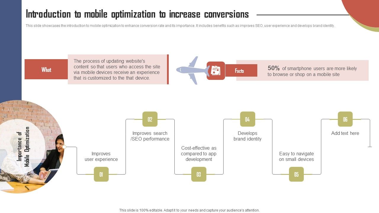 This slide showcases the introduction to mobile optimization to enhance conversion rate and its importance. It includes benefits such as improves SEO, user experience and develops brand identity. Slidegeeks has constructed Introduction To Mobile Optimization To Increase Effective Travel Marketing Guide For Improving Formats PDF after conducting extensive research and examination. These presentation templates are constantly being generated and modified based on user preferences and critiques from editors. Here, you will find the most attractive templates for a range of purposes while taking into account ratings and remarks from users regarding the content. This is an excellent jumping-off point to explore our content and will give new users an insight into our top-notch PowerPoint Templates.