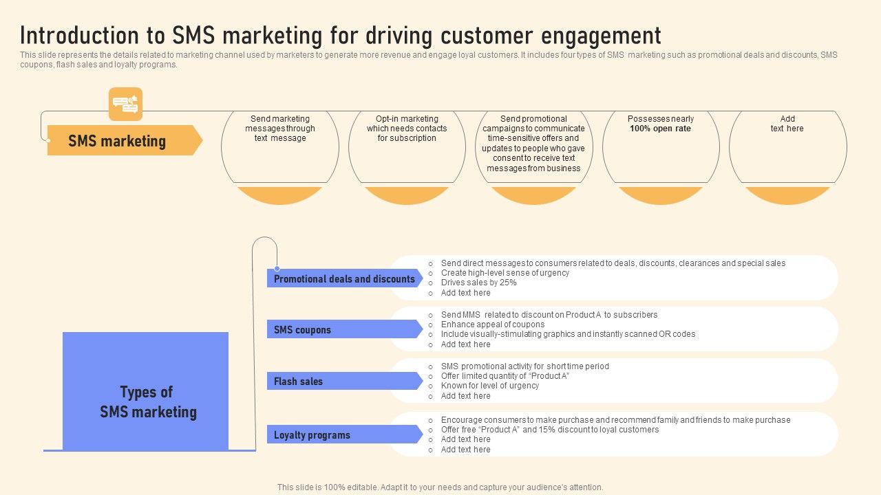 This slide represents the details related to marketing channel used by marketers to generate more revenue and engage loyal customers. It includes four types of SMS marketing such as promotional deals and discounts, SMS coupons, flash sales and loyalty programs. There are so many reasons you need a Introduction To SMS Marketing For Driving Customer Engagement Topics PDF. The first reason is you can not spend time making everything from scratch, Thus, Slidegeeks has made presentation templates for you too. You can easily download these templates from our website easily.