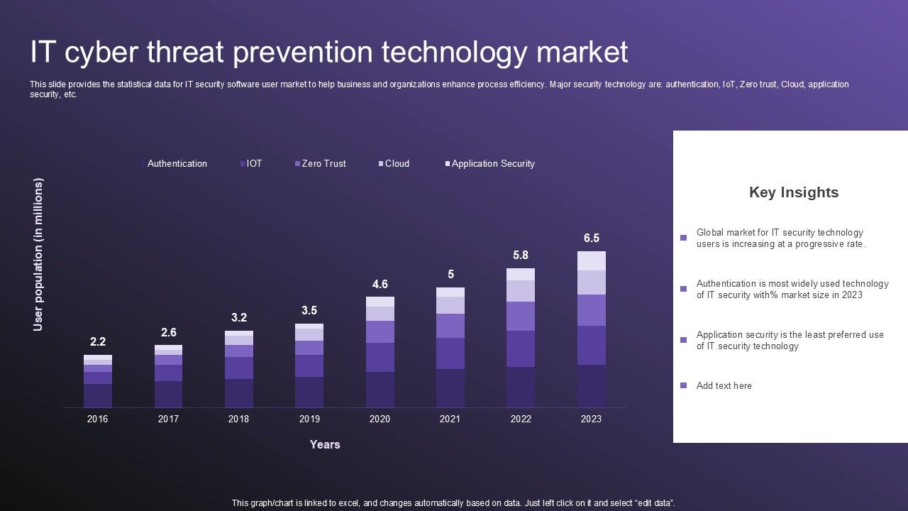 This slide provides the statistical data for IT security software user market to help business and organizations enhance process efficiency. Major security technology are authentication, IoT, Zero trust, Cloud, application security, etc. Pitch your topic with ease and precision using this IT Cyber Threat Prevention Technology Market Topics PDF. This layout presents information on Key Insights, Progressive Rate, Technology. It is also available for immediate download and adjustment. So, changes can be made in the color, design, graphics or any other component to create a unique layout.