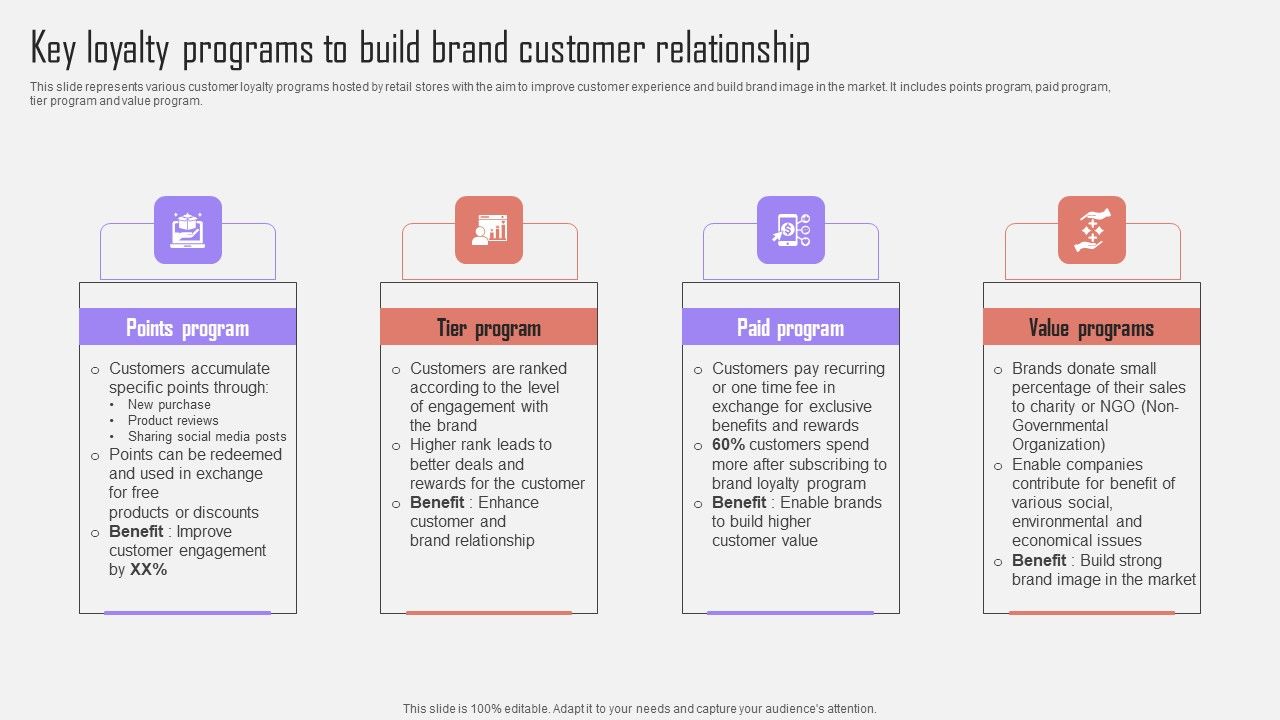 This slide represents various customer loyalty programs hosted by retail stores with the aim to improve customer experience and build brand image in the market. It includes points program, paid program, tier program and value program. Whether you have daily or monthly meetings, a brilliant presentation is necessary. Key Loyalty Programs To Build Brand Customer Optimizing Customer Purchase Experience By Executing Ideas PDF can be your best option for delivering a presentation. Represent everything in detail using Key Loyalty Programs To Build Brand Customer Optimizing Customer Purchase Experience By Executing Ideas PDF and make yourself stand out in meetings. The template is versatile and follows a structure that will cater to your requirements. All the templates prepared by Slidegeeks are easy to download and edit. Our research experts have taken care of the corporate themes as well. So, give it a try and see the results.
