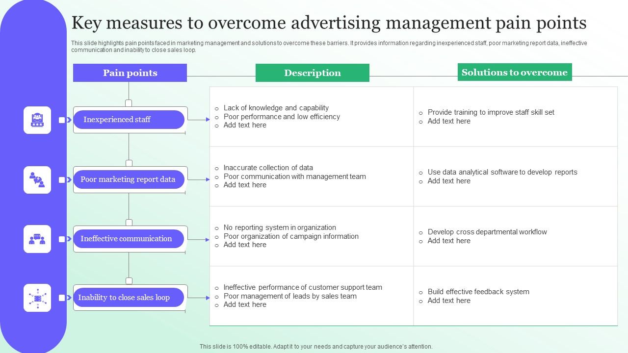 This slide highlights pain points faced in marketing management and solutions to overcome these barriers. It provides information regarding inexperienced staff, poor marketing report data, ineffective communication and inability to close sales loop. Pitch your topic with ease and precision using this Key Measures To Overcome Advertising Management Pain Points Pictures PDF. This layout presents information on Inexperienced Staff, Poor Marketing Report Data, Ineffective Communication, Inability Close Sales Loop. It is also available for immediate download and adjustment. So, changes can be made in the color, design, graphics or any other component to create a unique layout.
