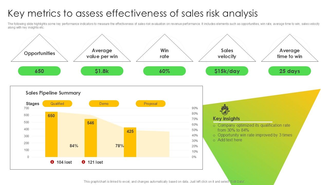 The following slide highlights some key performance indicators to measure the effectiveness of sales risk evaluation on revenue performance. It includes elements such as opportunities, win rate, average time to win, sales velocity along with key insights etc. Whether you have daily or monthly meetings, a brilliant presentation is necessary. Key Metrics To Assess Effectiveness Of Sales Risk Analysis Topics PDF can be your best option for delivering a presentation. Represent everything in detail using Key Metrics To Assess Effectiveness Of Sales Risk Analysis Topics PDF and make yourself stand out in meetings. The template is versatile and follows a structure that will cater to your requirements. All the templates prepared by Slidegeeks are easy to download and edit. Our research experts have taken care of the corporate themes as well. So, give it a try and see the results.