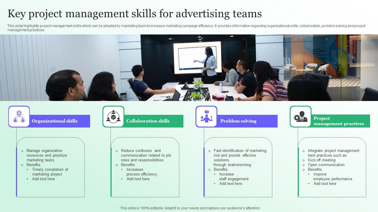 This slide highlights project management skills which can be adopted by marketing team to increase marketing campaign efficiency. It provides information regarding organizational skills, collaboration, problem solving and project management practices. Persuade your audience using this Key Project Management Skills For Advertising Teams Background PDF. This PPT design covers four stages, thus making it a great tool to use. It also caters to a variety of topics including Organizational Skills, Collaboration Skills, Problem Solving, Project Management Practices . Download this PPT design now to present a convincing pitch that not only emphasizes the topic but also showcases your presentation skills.