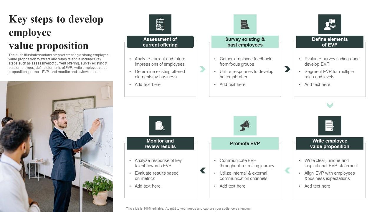 The slide illustrates various steps of creating a strong employee value proposition to attract and retain talent. It includes key steps such as assessment of current offering, survey existing and past employees, define elements of EVP, write employee value proposition, promote EVP and monitor and review results. Retrieve professionally designed Key Steps To Develop Employee Value Proposition Infographics PDF to effectively convey your message and captivate your listeners. Save time by selecting pre made slideshows that are appropriate for various topics, from business to educational purposes. These themes come in many different styles, from creative to corporate, and all of them are easily adjustable and can be edited quickly. Access them as PowerPoint templates or as Google Slides themes. You do not have to go on a hunt for the perfect presentation because Slidegeeks got you covered from everywhere.