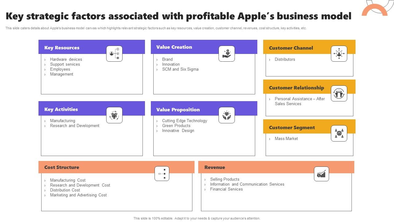 This slide caters details about Apples business model canvas which highlights relevant strategic factors such as key resources, value creation, customer channel, revenues, cost structure, key activities, etc. From laying roadmaps to briefing everything in detail, our templates are perfect for you. You can set the stage with your presentation slides. All you have to do is download these easy to edit and customizable templates. Key Strategic Factors Associated With Profitable Apples Business Model Themes PDF will help you deliver an outstanding performance that everyone would remember and praise you for. Do download this presentation today.